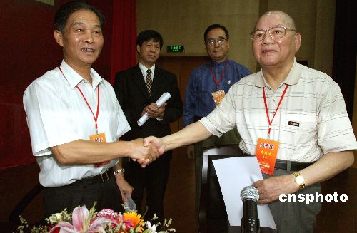 7月5日,正在厦门举办的“2007年两岸侨联和平与发展论坛”通过并签署了《两岸侨联和平与发展论坛倡议书》。图为中国侨联主席林兆枢(前排左)和台湾侨联总会理事长吴振波(前排右)在倡议书上签字。中新社发 张勤 摄