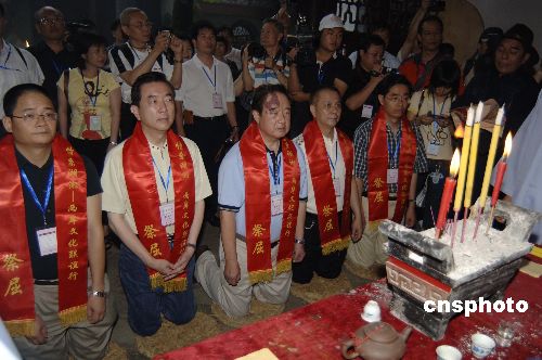 | 7月11日,参加由中华文化联谊会主办的“情系湖湘——两岸文化联谊行”的二百余位台湾、香港、澳门文化界人士共同来到湖南省汨罗市,参访屈子祠,祭拜伟大诗人屈原。澳门基金会行政委员吴志良、台湾中国文化大学法研所教授、海基会前秘书长焦仁和、华视文教基金会董事长周蓉生、香港中华文化总会副监事长杨升建、文化部港澳台司司长助理、中华文化联谊会会长助理汪志刚(从左至右)等代表行祭拜礼。中新社发 徐曦弋 摄