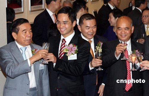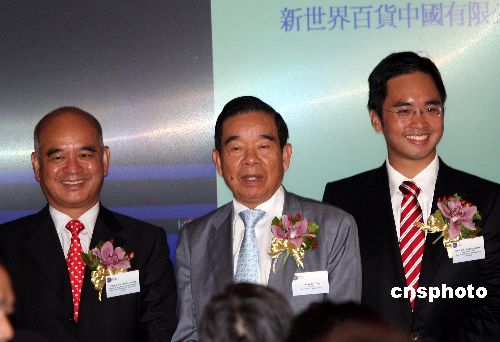 七月十二日,新世界发展主席郑裕彤、董事总经理郑家纯、新百货执行董事郑志刚三代同堂出席新百货在港交所得上市仪式。此前不久,新世界发展遭歹徒针对性施袭。中新社发 武仲林 摄