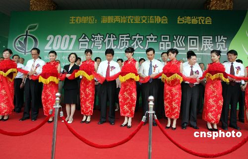 | 7月20日,“2007台湾优质农产品巡回展览”在上海开幕,农业部副部长尹成杰(右五)、国台办副主任叶克冬(右三)、上海市副市长胡延照(左五)等为该展览开幕剪彩。该展览是由海峡两岸农业交流协会与台湾省农会共同主办,旨在进一步推进海峡两岸农业交流与合作,七月二十日至二十五日分别在上海、南京、福州、武汉、广州、大连等地举办,主展场设在上海农业展览馆。中新社发 潘索菲 摄