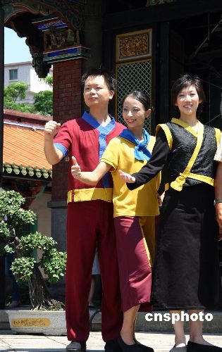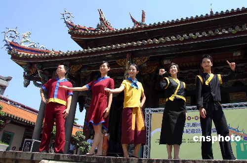 对春秋时代“深衣”改良而成的五套服装七月二十一日经由台北市民政局发表后,正式成为台北孔庙的工作服。当日上午,在台北孔庙大成殿前,工作服由受邀前来表演的“梅门国乐团”少年学员一并演示。中新社发 刘舒凌 摄
