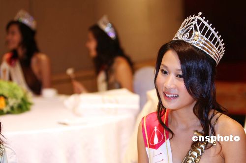 7月22日,新出炉的二○○七年度香港小姐冠军张嘉儿、亚军王君及季军周美欣在香格里拉酒店登台亮相,与新闻界畅谈选美获奖感受。中新社发 洪少葵 摄