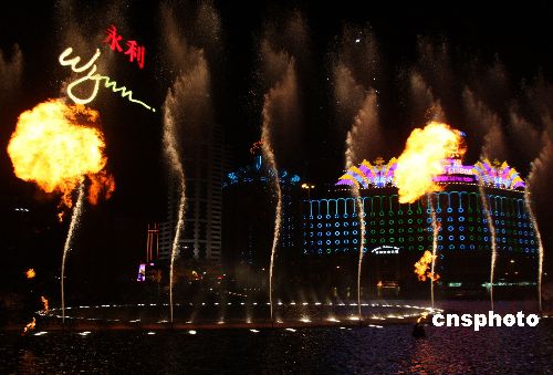 盛夏时节的夜晚,与澳门博采业龙头老大“葡京酒店”一街之隔、新近开业的“永利娱乐场”门前巨大喷泉水池,不停地升起多彩多姿的水柱并配合熊熊的火炬颇为壮观。据一些风水先生解释,永利娱乐场是用“水火齐攻”的方式向酷似鸟笼的“葡京娱乐场”发起挑战。近年,澳门博采业发展极为迅速,众多欧美财团背景的超级娱乐场及度假酒店先后开业。中新社发 任晨鸣 摄