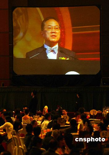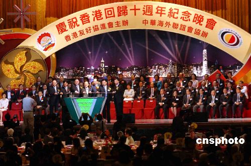 香港友好协进会庆祝香港回归10周年暨成立18周年纪念晚会,26日在会展举行,香港特首曾荫权等主持亮灯仪式。中新社发 谭达明 摄