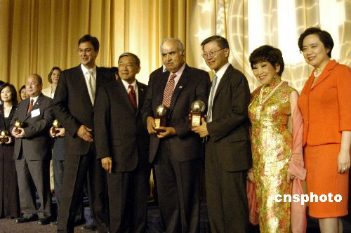 总部设在华盛顿的美国国际领袖基金会七月二十六日晚在华盛顿颁发年度亚太裔美国人先锋奖,著名华裔科学家何大一(右三)和有美国“硅谷之父”美誉的印度裔科学家堪瓦尔·雷西(右四)获特别奖,另外十二名杰出亚裔人士获得先锋奖。图为颁奖晚会现场情景。中新社发 邱江波 摄