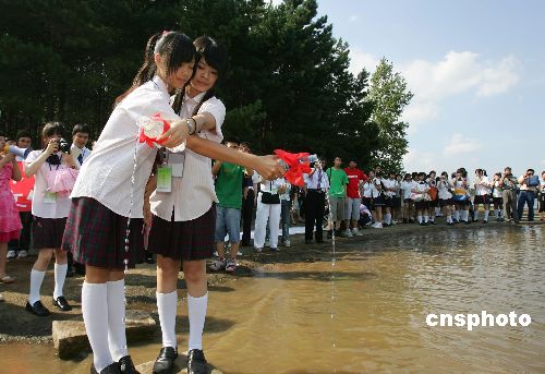 七月二十八日,台湾华冈艺校的两名学生把两瓶日月潭的水注入到长春净月潭中,由此拉开了“台湾中学师生吉林黑土地文化之旅”的序幕。本次共有台湾的五十名师生来到长春。在未来几天里,他们将分别在长春、吉林、延边进行参观访问和文化交流。中新社发 吴兆飞 摄