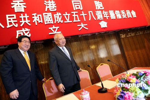 7月31日,中联办主任高祀仁、政协副主席董建华主持香港同胞庆祝中华人民共和国成立58周年筹委会举行成立大会。来自全港近20个界别的750多位人士应邀出任筹委会委员,大会并通过庆祝国庆活动形式、举行日期及地点。中新社发 洪少葵 摄