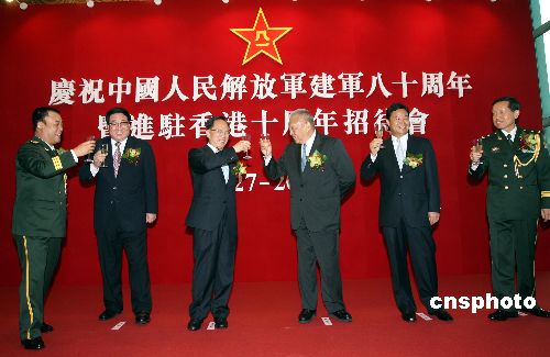 八月一日晚,驻港部队在香港中环军营举办“庆祝中国人民解放军建军八十周年暨进驻香港十周年招待酒会”,驻军司令员王继堂中将、中央政府驻港联络办公室主任高祀仁、香港特区行政长官曾荫权、全国政协副主席董建华、外交部驻香港特别行政区特派员吕新华﹑驻军政治委员刘良凯少将〔左起〕等出席了酒会。中新社发 武仲林 摄
