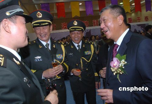 八月一日,澳门特首何厚铧在庆祝中国人民解放军建军八十周年招待会上,在驻澳门部队司令员刘联华少将(左二)、政委李文潮少将(左三)的陪同下,饶有兴致地观看驻澳部队指战员身着的“零七式”新军装。 中新社发 史利 摄