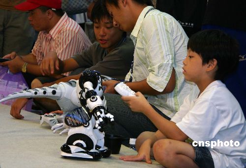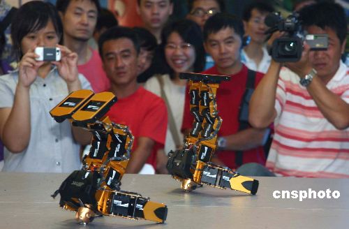 “二00七台北电脑应用展”八月二日开幕,展会设置的“智慧馆”推出产自台湾及海外的近十种机器人,其具备的灵巧性让它们能够跟随音乐节拍作连贯的复杂动作,甚为吸引人。中新社发 刘舒凌 摄