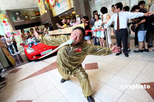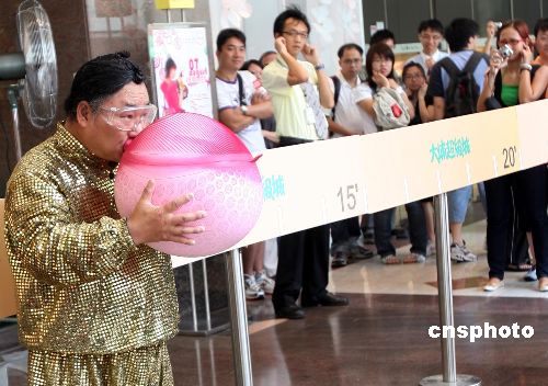 8月5日,来自上海的“基尼斯记录”保持者祁德华在香港新太阳广场表演绝活吹爆热水袋,令观众叹为观止。当日,拥有丰富表演经验的祁德华向香港观众表演头发拉车、牙齿拉车、倒立喝水等精彩纷呈的节目。中新社发 洪少葵 摄