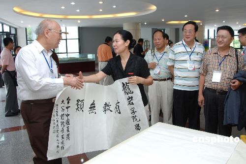 八月八日,台湾客家文化专家学者参观福建龙岩学院,台湾中国医药大学前院长王廷辅(前排左一)参观龙岩学院时书赠:“有教无类”。中新社发 郑祚声 摄