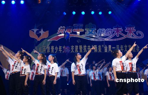 八月九日晚,台湾金门少年合唱团在闽东福鼎表演舞台剧《火金姑的愿望》。当晚,第七届“闽南风·海峡情”两岸青少年文化交流暨抗击“桑美”台风一周年文艺晚会在“桑美”台风重灾区福鼎举行。中新社发 林增光 摄