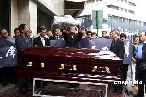 香港民建联主席马力的遗体8月11日从广州运抵香港殡仪馆安放,民建联众多党员在殡仪馆外迎接,并进行默哀仪式,许多人悲痛垂泪,为其英年早逝,深感痛惜。图为民建联副主席谭耀宗高高举起白色的花束向灵柩鞠躬献花。中新社发 王丽南 摄