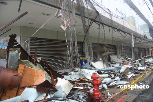 强台风圣帕八月十八日凌晨登陆台湾,台北市一街头广告牌被吹倒。中新社发 曾嘉 摄