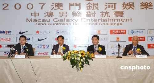 八月二十二日,澳门体育发展局在星际酒店举行记者招待会,宣布2007澳门银河娱乐中澳男篮对抗赛将于九月五日在澳门举行,中国男篮将与澳大利亚国家篮球联赛2006年度冠军的墨尔本老虎队举行比赛。届时,姚明将参加此次比赛。澳门银河娱乐集团作为此次比赛的冠名助商。中新社发 史利 摄