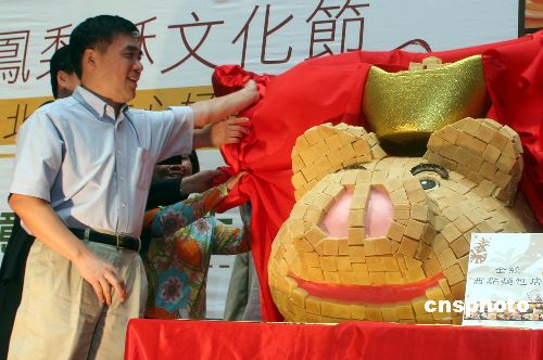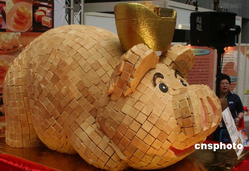 八月二十七日,由一家业者手工制作、重达五百公斤的凤梨酥“金猪”,亮相二00七台北创意凤梨酥大赛现场。中新社发 董会峰 摄