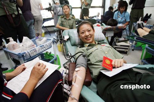 8月31日,解放军驻香港队伍的400名官兵在军营参加献血,向香港市民奉献爱心。解放军进驻香港十年间,共参加了9次无偿献血活动,计有3600余名官兵献血160万毫升。今年是驻军第十次参加无偿献血。中新社发 洪少葵 摄