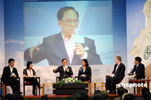 9月4日下午,香港特区行政长官曾荫权抵达香港大学,与大约六百名师生,交流对话。曾荫权致辞后与台上的四名学生代表,及台下的师生对话,另外,在海外的香港大学校友透过视像也可与之交流意见。活动是由香港大学与“齐心香港高飞”机构举办,邀请特首曾荫权与学生就香港的愿景以及施政交流分享。中新社发 洪少葵 摄