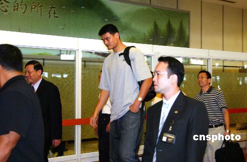 NBA第一中锋、大陆著名球星姚明,今天下午乘坐澳门航空NX622班机于下午三时三十分抵达台北,开始为期三天的“纯篮球”交流访问。这是小巨人姚明成为NBA球员后第一次访台,也是他三度造访宝岛。中新社发 崔煜芳 摄
