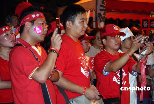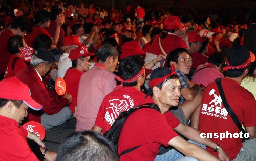 红衫军九月九日倒扁纪念周年再度走上街头,在台北举办烛光晚会。图为民众穿着红色上衣聚集在现场。