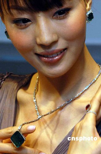 香港苏富比将于10月上旬在会展举行珠宝及翡翠首饰拍卖会,共超过3佰件珍品,总估价逾3亿5千万港元。11日,苏富比在传媒预展会上,展示当中共4件弥足珍贵的翡翠首饰(蛋面翡翠镶钻石耳坠、蛋面翡翠镶钻石项、蛋面翡翠镶钻石指环、满色翡翠手镯),总估价约为2千万港元以上。中新社发 谭达明 摄