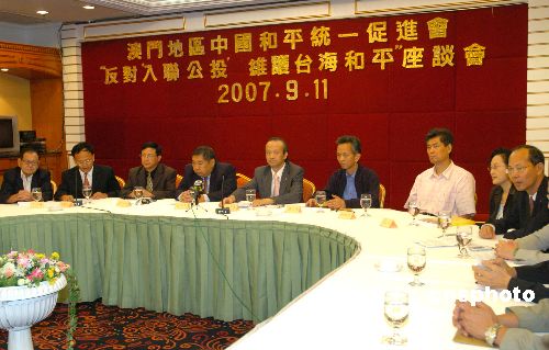 九月十一日晚,澳门地区中国和平统一促进会在万豪轩酒店举行座谈会。舆会的澳门各界人士纷纷表示:“反对‘入联公投’,维护台海和平”。座谈会通过了澳门地区中国和平统一促进会“反对‘入联公投’,维护台海和平”的声明。 中新社发 史利 摄