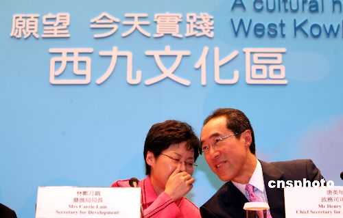 九月十二日,香港特别行政区政务司司长唐英年在新闻发布会上表示,会分开处理西九计划的文化设施及卖地安排,政府会先一笔过拨款190亿元给西九管理局,统筹及规划西九项目。 图为唐英年(右)与发展局长林郑月娥在发布会上。中新社发 武仲林 摄