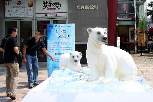 九月十三日,台北举行“一人一筷·抗暖救地球”活动,主办方在室外设“融冰的北极熊”装置,提醒民众正视地球变暖,呼吁停止使用免洗筷为环保尽一份心力。中新社发 崔煜芳 摄