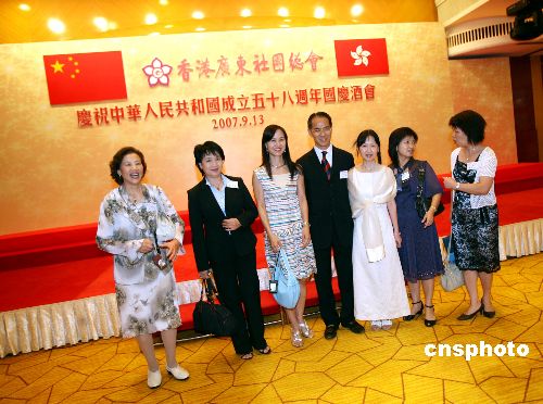 九月十三日晚香港广东社团总会举行隆重的“庆祝中华人民共和国成立五十八周年国庆酒会”。香港特区行政长官曾荫权、中央驻港联络办公室主任高祀仁、外交部驻港副特派员解哓岩担任主礼嘉宾。社会知名人士、各界嘉宾、会员等近六百人到会庆贺。图为嘉宾们纷纷在主席台前拍照留念。中新社发 王丽南 摄