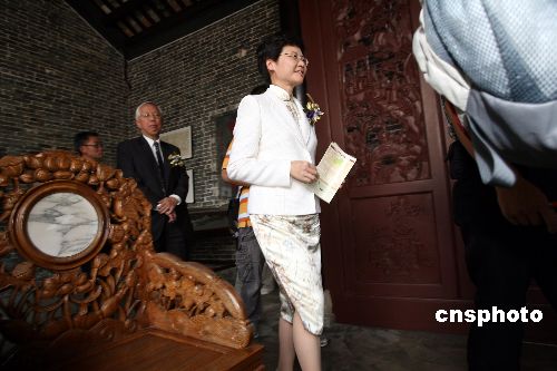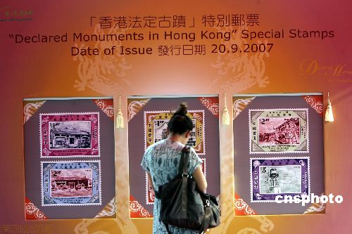 九月二十日,香港邮政在九龙寨城公园举行“香港法定古迹”特别邮票发行仪式,特区政府发展局局长林郑月娥、古物谘询委员会主席何承天和香港邮政署长谭荣邦等主礼。据悉,此次发行的六款邮票,分别以铜锣湾天后庙(一元四角)、旧湾仔邮政局(一元八角)、前中区警署(二元四角)、前九龙寨城衙门(二元五角)、龙跃头觐龙围门楼(三元)和灯笼洲灯塔(五元)这六处本港古迹为题。中新社发 武仲林 摄