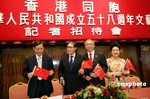 9月25日,香港同胞庆祝国庆筹委会召开记者会,文体表演主任霍震霆(左二)、秘书长胡经昌(右二)、宣传副主任朱莲芬(右)及民政事务局助理署长胡敏成,向传媒介绍10月1日晚于香港体育馆举办的大型国庆文艺晚会。中新社发 洪少葵 摄