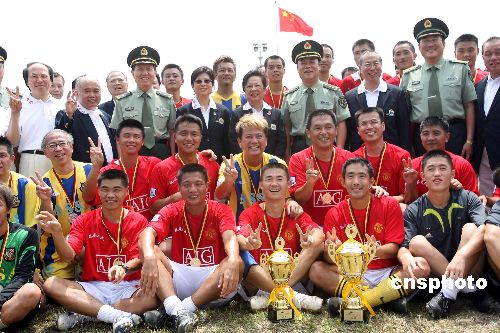 九月二十六日,由全国政协副主席董建华先生的夫人董赵洪娉、香港特首曾荫权先生的夫人曾鲍笑薇率领的中秋探访团赴驻港部队进行慰问,以增进香港社会各界和驻军官兵之间的交流和沟通。今年是中国人民解放军进驻香港十周年,也是中秋探访团第十次来到驻军进行慰问。图为香港明星足球队与驻港部队友谊赛后合影留念。中新社发 武仲林 摄