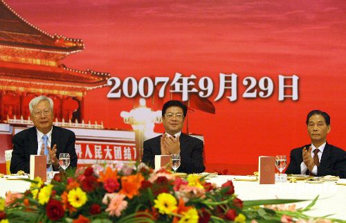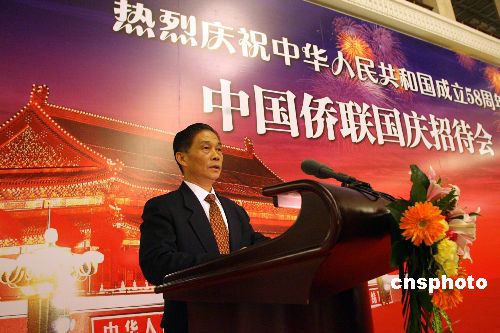 9月29日,中国侨联在人民大会堂举行国庆招待会。中共中央政治局委员、全国人大常委会副委员长王兆国、全国政协副主席罗豪才,与来自海外华侨华人、香港和澳门特别行政区、台湾同胞以及归侨侨眷代表700余人欢聚一堂,热烈庆祝中华人民共和国成立58周年。中国侨联主席林兆枢在招待会上致辞。中新社发 张勤 摄