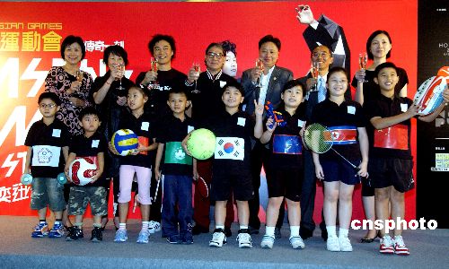 10月15日,第五届东亚运动会筹委会主席霍震霆(后左四)与红歌星陈奕迅(后左三)与代表不同国家及体育项目的小朋友共同预祝2009东亚运动会成功。当日,香港东亚运动会宣布将与陈奕迅合作举行两场演唱会,以音乐唤起不同年龄及阶层市民对体育的热情,一同投入08奥运和2009东亚运动会热潮之中。中新社发 蔡蔓莉 摄