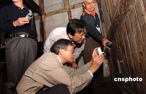 十月二十八日,台湾成功大学历史系教授林德政(图前)用相机拍下贴在复兴堡墙壁上的“东南日报”。当日,前来参加“福建省战时省会永安:国共合作与闽台关系学术报告会”的两岸专家学者在福建永安参观考察中国国民党直属台湾党部旧址——复兴堡。中新社发 王东明 摄