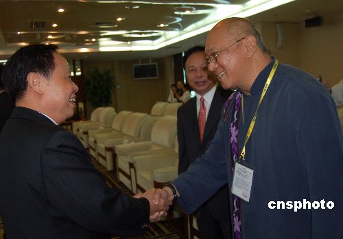 十月二十九日,二〇〇七海外华商相聚中国—东盟博览会暨广西商机介绍会在广西南宁举行,两百名华商参加会议,会上签约十八个项目,金额三点八六亿美元。会前广西壮族自治区主席陆兵(左)会见出席会议的著名侨领陈嘉庚先生的长孙、新加坡华德私人有限公司董事长陈立人。中新社发 刘万强 摄