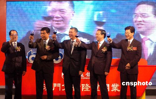 十一月一日晚,中国交通银行澳门分行开业仪式在旅游塔举行,澳门特首何厚铧(中)举杯祝贺开业。中新社发 史利 摄