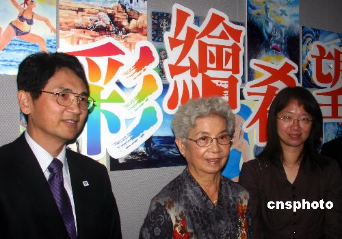 75岁高龄的台湾老奶奶简淑媛(中)沉醉于国画世界,以绘画为寄托配合治疗,摆脱癌症阴霾。图为11月6日简淑媛出席台湾癌症希望协会公益活动,鼓励癌症患者学习绘画,积极追求美好事物。她的作品去年参加第一届《彩绘希望》比赛,并被选送英国参与评奖。中新社发 刘舒凌 摄