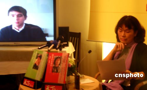 台湾作家龙应台与长子安德烈(图左)的三十六封家书在台北辑录出版。图为在香港大学就读经济系、有德国血统的安德烈,以视讯方式参与十一月七日下午于台北举办的一场茶会。龙应台表示,两代人之间也要寻找方法,开一扇沟通之门。中新社发 刘舒凌 摄
