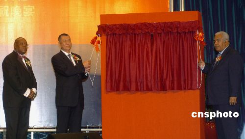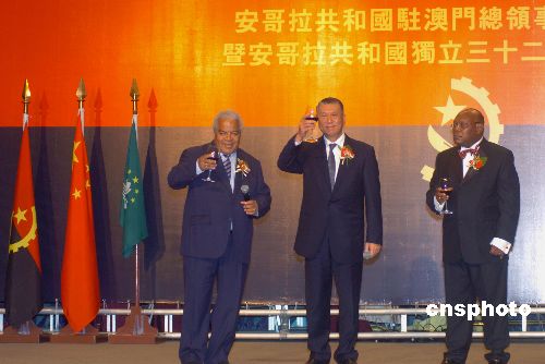 十一月九日晚,安哥拉共和国驻澳门总领事馆开幕典礼暨安哥拉独立三十二周年庆祝酒会在澳门渔人码头举行,澳门特首何厚铧与安哥拉共和国外交部秘书长Manuel Gomes dos Santos为安哥拉共和国驻澳门总领事馆揭幕。 中新社发 史利 摄