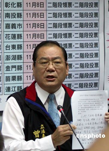 中国国民党立法院党团十一月十四日表示,支持十八个县市选举委员会的决定,希望明年“立委”选举与“公投”同日举行时,采用“二阶段领票,二阶段投票”方式,让选举顺畅单纯。图为国民党政策会执行长曾永权出示全台湾二十五个县市议会议长的共同声明,他们表示支持这一投票方式。中新社发 刘舒凌 摄