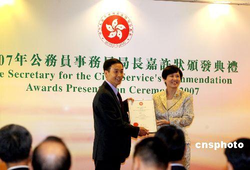 十一月十五日,香港举行公务员事务局局长嘉许状颁发典礼,为来自三十八个局及部门的七十五名优秀公务员颁发嘉许状,表扬他们的杰出表现。中新社发 王丽南 摄