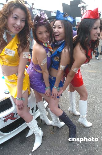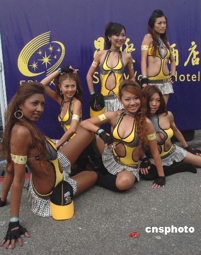 十一月十八日,几位美女在第五十四届澳门格兰披治大赛车上亮相。性感的服饰。苗条的身材,动人的眼神,争艳斗丽,各领风骚。中新社发 史利 摄
