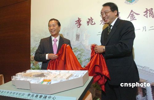 11月22日,香港恒基兆业地产有限公司主席李兆基博士捐赠五亿港元予香港大学,以促进港大未来的发展计划,会上李兆基博士(左)与香港大学校长徐立之教授为“香港大学百周年校园---李兆基会议中心”模型举行揭幕仪式,新校园计划于2011至2012年落成。中新社发 邓庆乐 摄