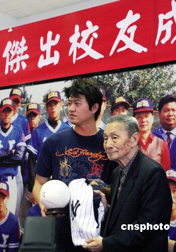11月23日,台湾著名棒球明星王建民回到高中母校台北县土城私立中华中学,受到学弟、妹们的英雄式欢迎,并成为该中学创校45年以来,获颁杰出校友奖的第一人。图为王建民与87岁的中学创办人卞堃互换纪念品。据悉,中华中学一向是台湾棒球运动员摇篮,自1981年与荣民工程公司前身荣民工程事业管理处建教合作成立青棒队起,至今已培育出职棒好手110人,王建民于1996年至1998年就读该校。中新社发 黄少华 摄