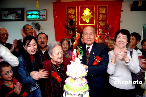 11月25日, 台胞潘祖培携夫人陈阿庆在子女及孙辈陪同下,回到福州市闽侯县南通镇泮洋自然村老家,与亲友欢聚。潘先生在接受亲友祝寿时,祈愿在有生之年能看到两岸三通、祖国统一。中新社发 郑祚声 摄