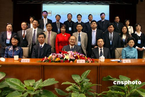 十一月二十六日,“第三期海外华文媒体高级研修班”在北京正式开班。本期研修班共邀请来自15个国家22家海外华文媒体的负责人参加。图为国务院侨办副主任赵阳(前中)、中国新闻社社长郭招金(前左二)等与研修班全体成员合影留念。中新社发 张勤 摄