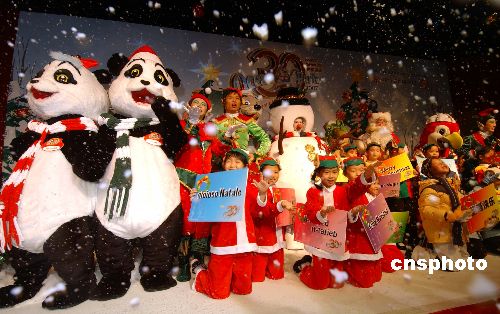 11月27日,香港海洋公园宣布,在12月15日至明年1月1日期间,将推出包括“冰雪世界”、“环球圣诞村”、“满场惊喜玩之不尽”、“大玩特玩”四个主题景点,为市民及游客带来白色的圣诞 。图为当日小朋友们、“大熊猫”及雪人在漫天飘雪的白色世界迎接即将到来的圣诞节。中新社发 蔡蔓莉 摄