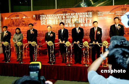 “从钱庄到现代银行-沪港银行业发展”展览,十一月二十七日在香港历史博物馆开幕,行政长官曾荫权(左4)、中央驻港联络办公室副主任郭莉(右4)、中国工商银行股份有限公司董事长姜建清(左3)、香港金融管理局总裁任志刚(右3)、特区民政事务局常任秘书长尤曾家丽、工商银行上海分行行长孙持平(右2)、康乐及文化事务署署长周达明(左1)、工商银行(亚洲)有限公司董事总经理朱琦为活动剪彩。中新社发 王丽南 摄